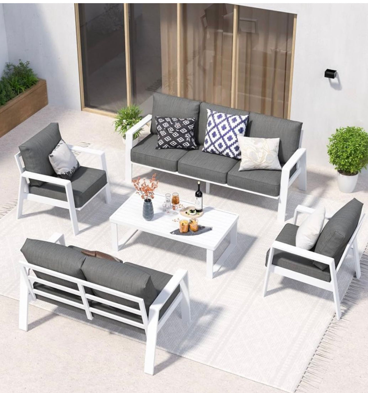 Pre-orden set 5 piezas aluminio blanco cojines gris oscuro.